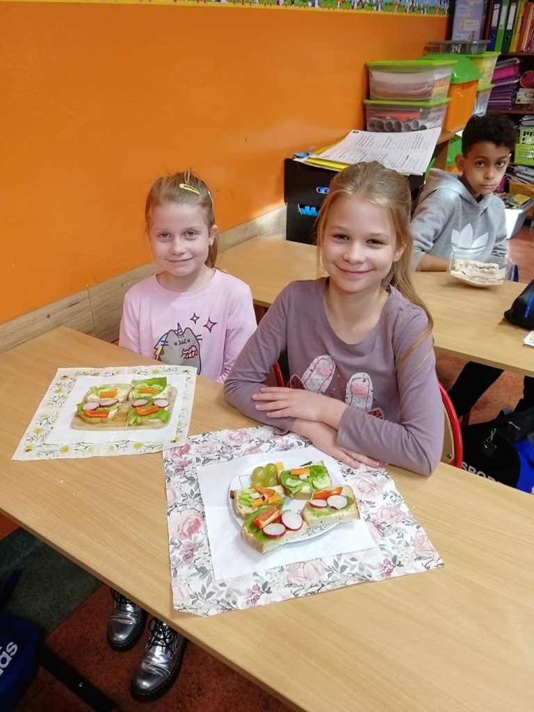 Pamiętając o tym, że śniadanie jest najważniejszym posiłkiem w ciągu dnia uczniowie klas I – III przygotowali wspólnie w swoich klasach zdrowe śniadanie. Na stołach królowała sałata, pomidory, ogórki, rzodkiewki, nie zabrakło też serów i wędlin. W trakcie przygotowywania kanapek, które wyglądały bardzo kolorowo i apetycznie uczniowie rozmawiali o wartościach odżywczych poszczególnych produktów. Poznawali zasady zdrowego odżywiania się i konieczności stosowania się do nich każdego dnia.